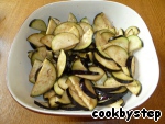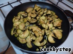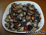 Слить образовавшуюся в процессе "вымачивания" жидкость и обжарить баклажаны на оливковом масле (масла нужно совсем немного, т. к. «вымоченные» баклажаны почти не впитывают масло в отличие от сырых).