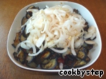 Баклажаны нарезать на полукружья и оставить в яичном «маринаде» на 15-20 минут. Баклажаны пустят сок и избавятся от горечи. На этом же этапе репчатый лук нарезать полукольцами и замариновать в растворе яблочного уксуса и воды (1:1).