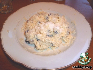 К творожным массам вмешать рис, изюм и 3 ст. л. сахара.