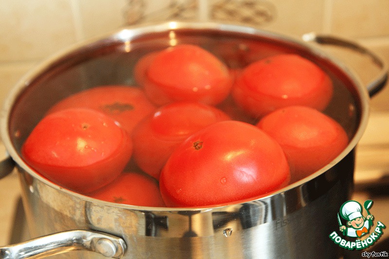 С таких "замоченных" помидор мы легко снимаем шкурку.