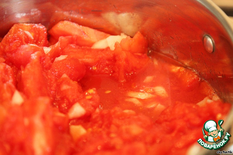 Добавляем нарезанный лук, доводим помидоры до кипения - у нас потихоньку выделяется сок. Моим помидорам для закипания понадобилось минут 15.