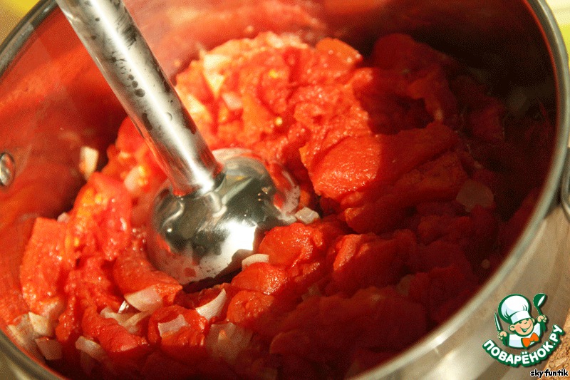 Теперь снимаем помидоры с огня и с помощью погружного блендера превращаем в пюре. Конечно, это можно сделать и другими приспособлениями, от вилки до кухонного комбайна.