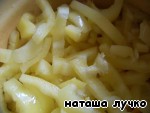 Через 20 минут добавить лук, нарезанный четвертинками колец.