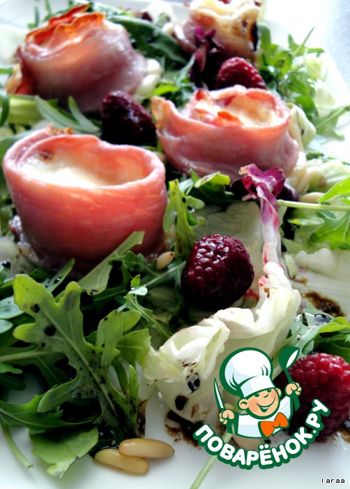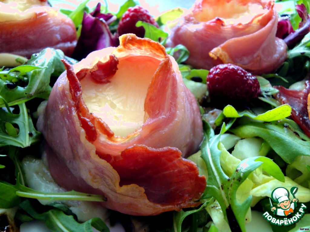 Просто восхитительное сочетание мягкого теплого сыра с запеченной корочкой бекона. В дополнение с салатом…………просто праздник.
