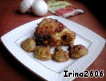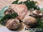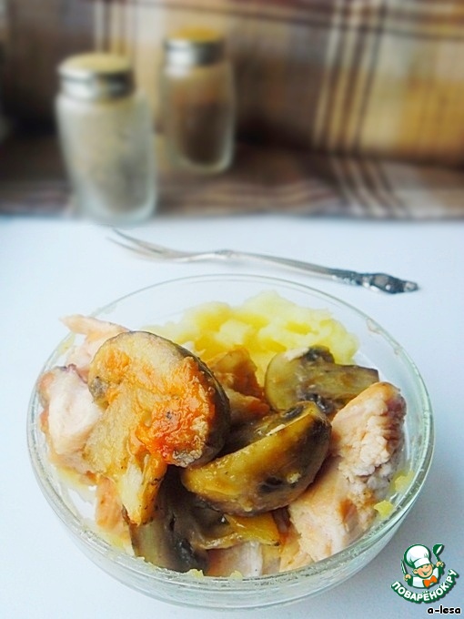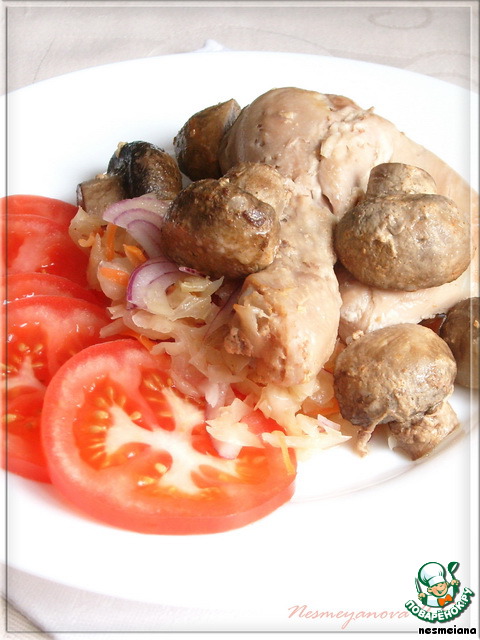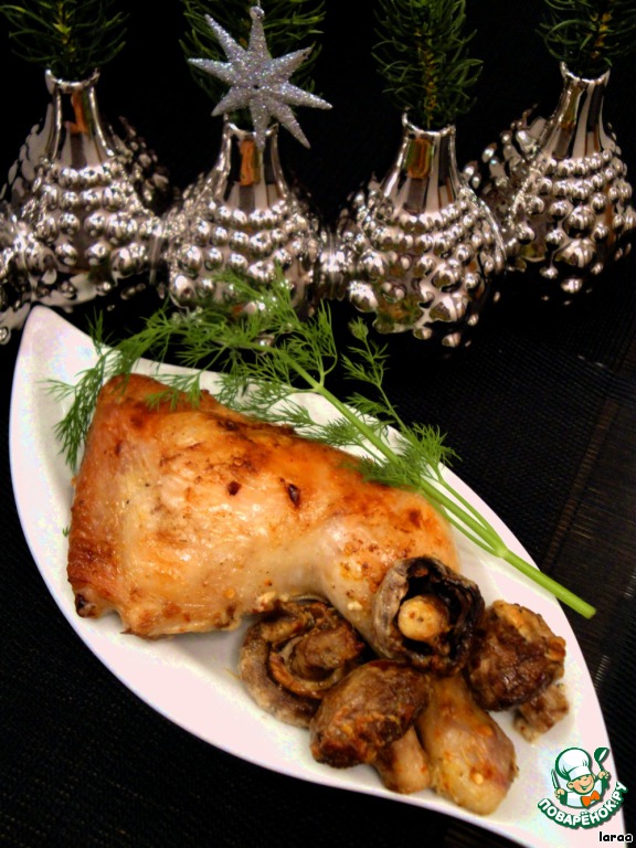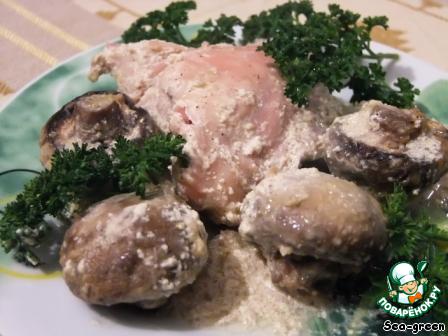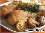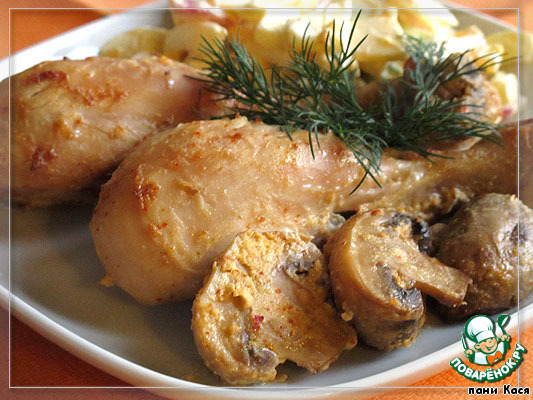 Подаем на порцию 2 кусочка курицы и половинки грибов. Лучше дополнить салатом.
