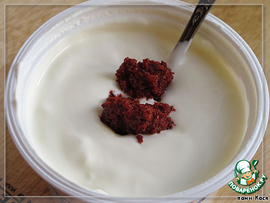 Сметану смешать с аджикой.