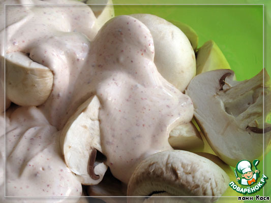 Грибы и курицу посолить, перемешать с соусом. И убрать на час в холодильник. Можно больше.