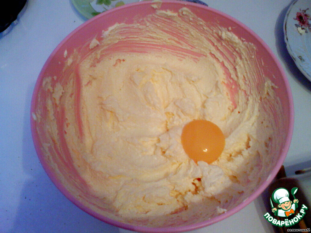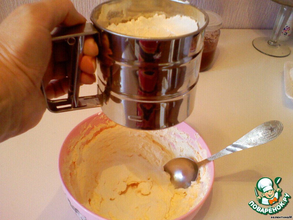 В эту масляную массу постепенно добавлять просеянную муку (крахмал добавляется в муку и просеивается вместе с ней), хорошо растирая ложкой до однородности. Затем не очень долго домесить тесто рукой.