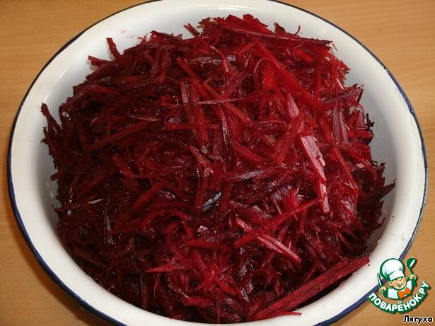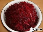 Свеклу нарезать соломкой. У меня специальная терка, что дает возможность проделать эту операцию очень быстро. -