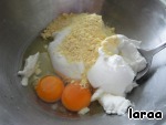 Пока тесто в холодильнике, приготовим начинки. Для первой начинки смешать творог, яйца, сахар, кукурузную муку и цедру лимона.