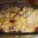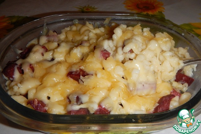 Буквально через 5 минут блюдо готово. Выкладываем его в форму для запекания. Можно «мясной ряд» перемешать со Шпетцле. Либо так и оставить: первый слой – Шпетцле, второй – «Мясной». В завершении необходимо блюдо посыпать тертым сыром. На мой взгляд, 75г сыра – это минимум.