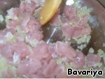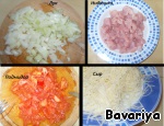 Вторая часть – «Мясная». Безусловно, и первую, и вторую часть можно выполнять одновременно. Все зависит от того, сколько у вас помощников. В любом случае, практически уже готовое блюдо мы будем дополнительно запекать в духовке. Так что, если Шпетцле немного остынут, то это не страшно. Итак, нарезаем «кубиками» индюшку, помидоры, лук, натираем на терке сыр.