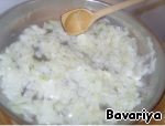 Ставим сковородку на огонь и жарим лук до золотистого цвета. Включаем духовку.