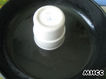 Берём круглую форму. У меня для этих целей сковорода со съёмной ручкой. Обмазываем её растительным маслом. И посредине ставим стакан, смотрите, выбирайте такой, чтобы не лопнул. Я взяла простой керамический бокал - память о столовой воинской части, где служила.