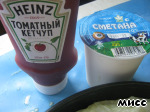 Делаем любимый соус. Я брала кетчуп и сметану. Можно обойтись одной сметаной или одним кетчупом. Можно смешать сметану с горчицей. У каждой хозяйки, опять-таки, свои соусы.