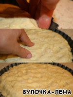 Достаем их холодильника охлажденное тесто. Раскатываем по форме. Я делаю все руками, без скалки. Если тесто совсем не поддается работе, можно добавить немного муки. Выкладываем тесто на сливы и аккуратно вминаем его по периметру, делая тем самым бортики, а также по всей поверхности, чтобы сливы погрузились в тесто.