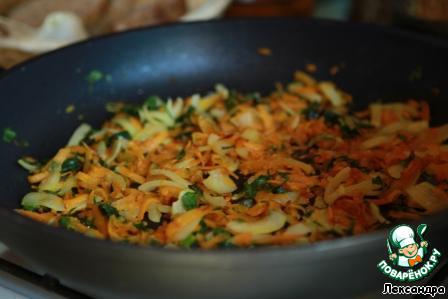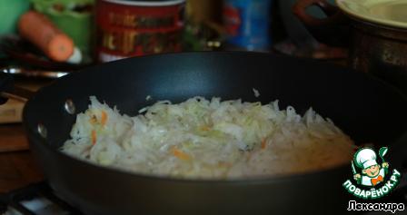 • Морковь, петрушку, репчатый лук пассеровать на сливочном масле, отдельно поджарить томатную пасту и муку.