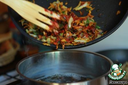• В грибной бульон добавляем тушеную капусту с овощами, томатную пасту, грибы, лавровый лист.