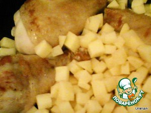 Куриные голени посолить, поперчить и обжарить почти до готовности. Нарезать кубиками очищенный картофель, сыр, мелко порезать грибы.