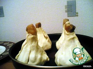 На квадрат из теста выложить начинку ~ 2-3 ст. ложки, установить посередине куриную голень.