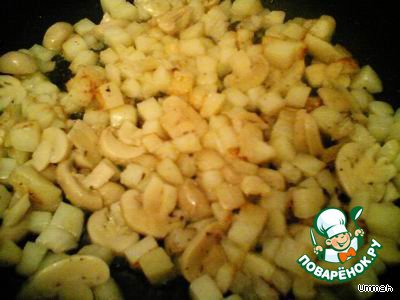 Можно в сковороду, где жарились куриные голени, можно отдельно, обжарить картофель и грибы, дать остыть.