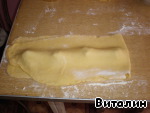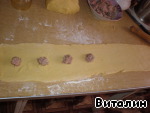 Затем я делаю так: раскатываю скалкой длинную, тонкую и узкую полоску, фарш (как на пельмени) уже готов.