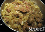 На другой сковороде поджарим мелко нарезанное мясо с луком.