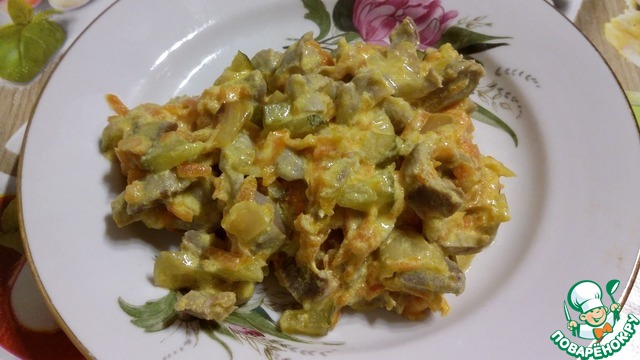 Добавить к нашим желудочкам сметану, готовый хрен и мелко порезанные маринованные огурчики! Хорошенько перемешать, присолить, поперчить и оставить тушиться еще минут на 10 на среднем огне.