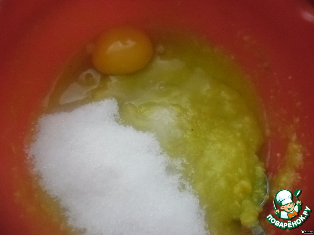 Тыквенное пюре смешать с мускатным орехом, солью и разрыхлителем. Добавить апельсиновую цедру. Я использовала 4 ст. л. "жмыха", оставшегося от [url=http://www.pova renok.ru/recipes/sho w/57690/url]апельсин ового напитка[/url].
