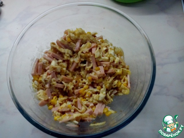 Соломкой нарезаем ветчину и добавляем к кукурузе.