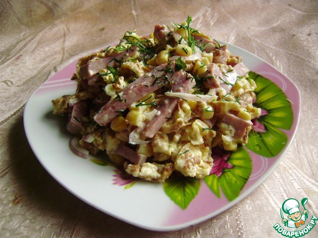 Сворачиваем омлетики трубочкой и нарезаем их. Отправляем всё в салат.