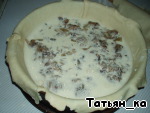 Выкладываем начинку (обжаренный лук с грибами) в формочку с тестом, заливаем сметаной с яйцами,