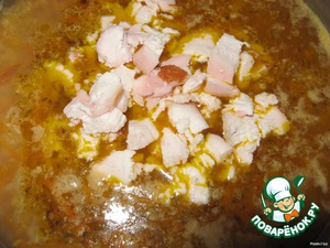 Положить в кастрюлю орегано, кусочки индейки. Довести до кипения.