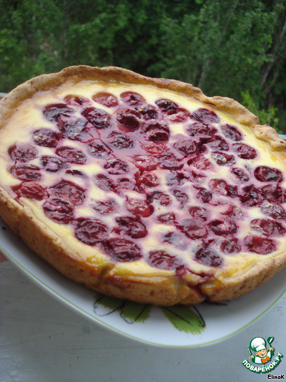 Выложить вишню или любую другую ягоду на тесто и залить творожной массой. -