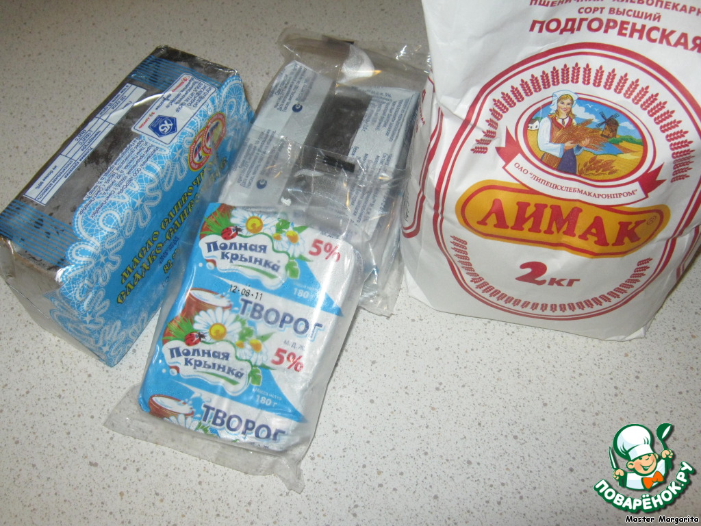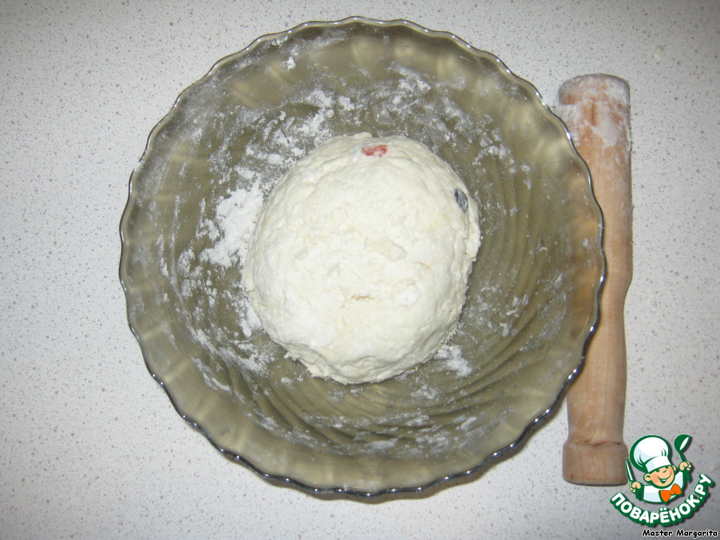 • Маргарин соединить с творогом, соль, муку, орехи и цукаты (если есть),