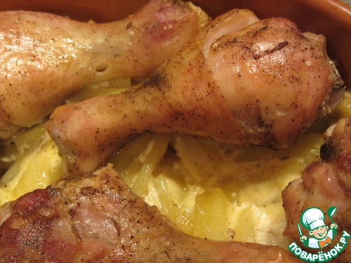 Окорочка (голени) вымыть, обсушить, посолить, поперчить и положить сверху картошки. На каждый кусок курицы положить по небольшому кусочку масла. Запекать в духовке при 200 градусах 1 час.