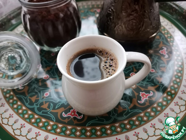Приступаем к волшебству. На дно разогретой турки кладем специи и кофе. Перемешиваем. И заливаем холодной водой. Ставим турочку на медленный огонь и доводим до кипения. Как только поднимается пена, снимаем турку с огня. Через несколько секунд снова ставим на огонь. Эту процедуру повторяем 3 раза. Ну, да! Целая церемония! ))) Вот и готов наш кофе по-восточному.