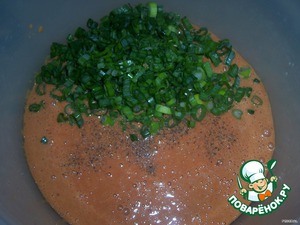 Вылить в миску, добавить порезанный зелeный лук, базилик, перемешать