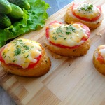 Духовку разогреть до 180*С. Хлеб нарезать ломтиками и срезать корки, так чтобы ломтики были чуть больше кружочков помидоров.
