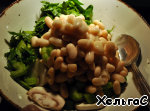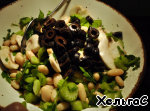 Очень мне понравился это салат. И сытный, и пикантный, и сочетание превосходное. Если красная фасоль хороша с кукурузой, кинзой и красным луком, то белая - с сельдереем, грибами-шампиньонами и черными маслинами, можно белое куриное мясо добавить.