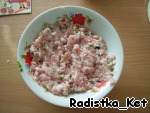 Делаем начинку для наших "чебуреков". Смешиваем любимый фарш с мелко нарезанным чесноком, петрушкой. Добавляем ложку растительного масла, солим, перчим по вкусу и 2-3 ложки воды, чтобы фарш можно было легко намазать на вафли.