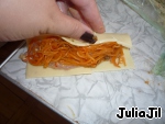 Теперь на этот маленький кусочек филешки кладем немного корейской морковки. Заворачиваем все (в трубочку у меня не получилось - сырок разломался ( ( (, я сложила сырок пополам).