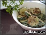 У меня была паста тахини неразбавленная; я добавила к 1 ст.л. 35 г воды, капельку оливкового масла и 1 ч.л. лимонного сока, соль, все быстро перемешала до нужной консистенции. Добавляем к огурцам.