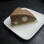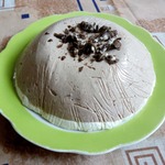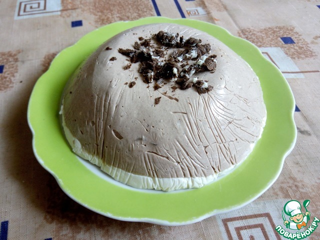 Далее десерт переворачиваем на сервировочную тарелку, снимаем без проблем плёнку. Верх украшаем по желанию. Я брала шоколадную стружку. |