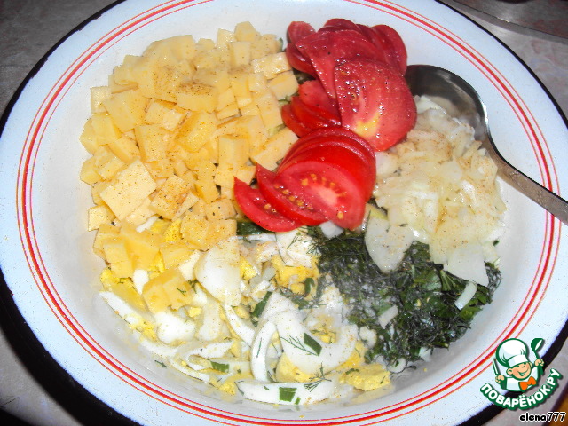Сыр нарезать маленькими кубиками. Добавить рубленую зелень. -