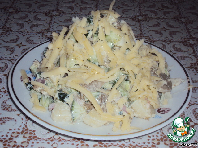 Очень вкусный и сытный салат, а грибной аромат и свежесть огурчика просто покоряют своим вкусом!