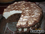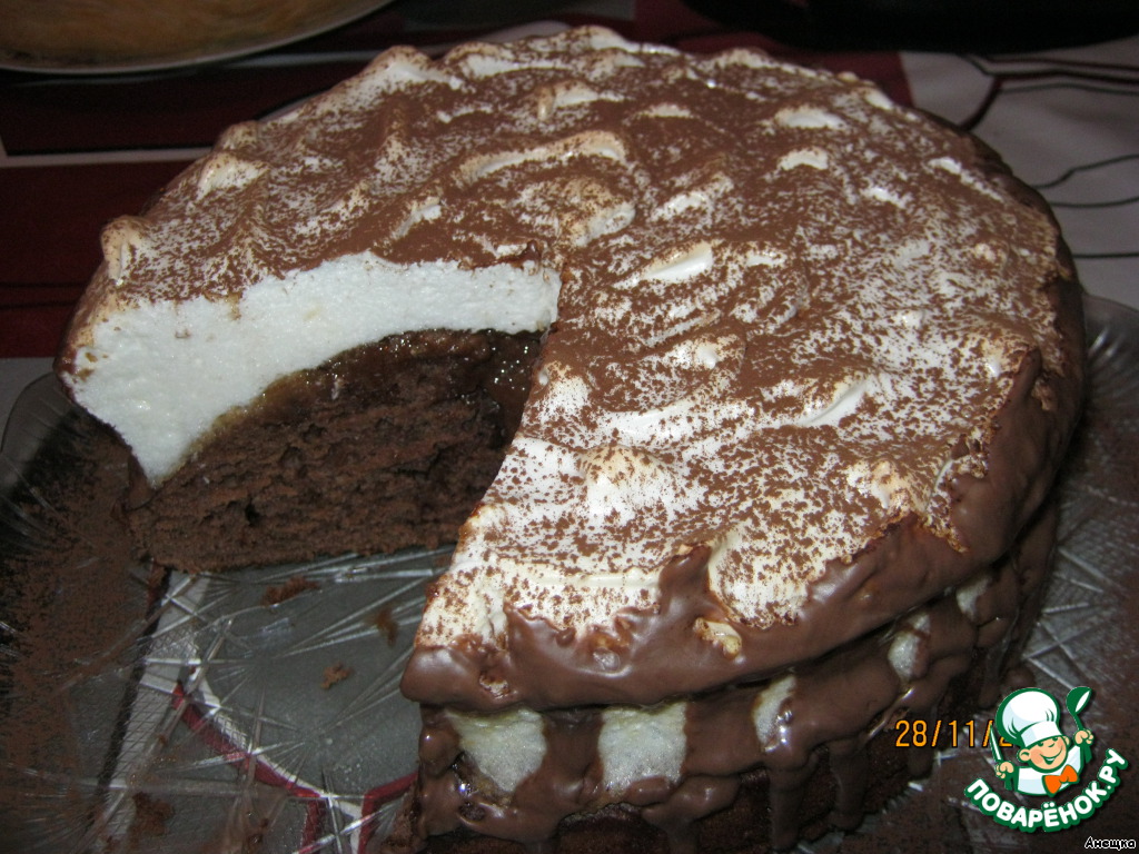 4 желтка растираем с 1 стаканом сахара. Добавляем 50г масла, 1 стакан тёплого кефира, 3 ч.л. какао, 2 стакана муки, перемешиваем.