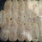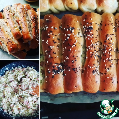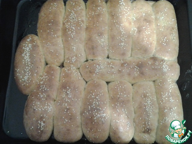 Выложить, прижимая друг к другу, все жгутики с начинкой швом вниз на смазанный противень.
