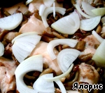 На курицу выкладываем грибы и крупно нарезанный лук.