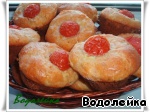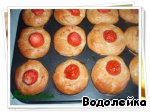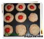 Теперь берем маленькие помидоры (лучше всего черри) и выкладываем сверху на каждую булочку, немного как бы вдавливая их в тесто.